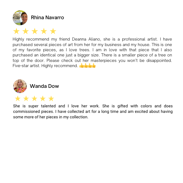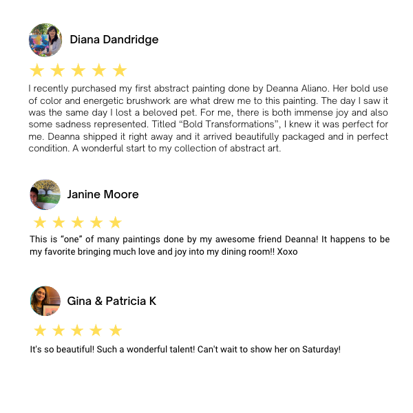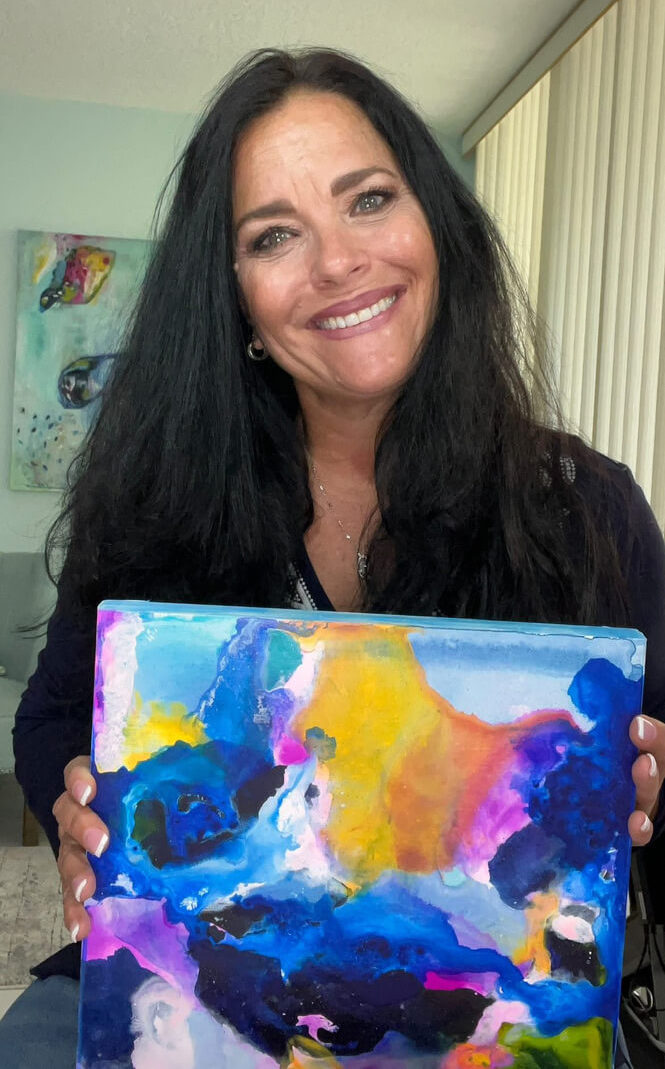 Deanna is a self-taught artist, whose gift for colors and composition was realized in 2017 after painting a piece for a friend. Living in Florida gives her so much inspiration for creating new pieces. Many of her paintings come from observing nature. Each painting has been educational and helps her grow as an artist. She recently started exploring acrylic fluid paints, acrylic inks and using many different types of mediums. She loves to take risks with vibrant colors, especially in her abstract paintings.